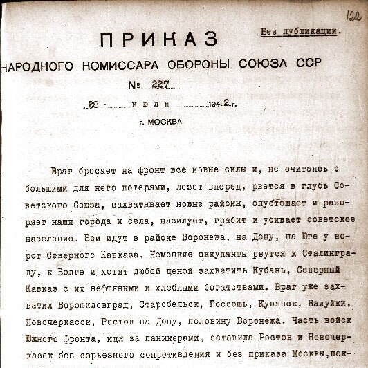Приказ № 227 Народного комиссара обороны СССР И. В. Сталина от 28 июля 1942 года, в сокращённом виде (включая призыв «Ни шагу назад!») зачитанный личному составу Красной армии вступил в силу.